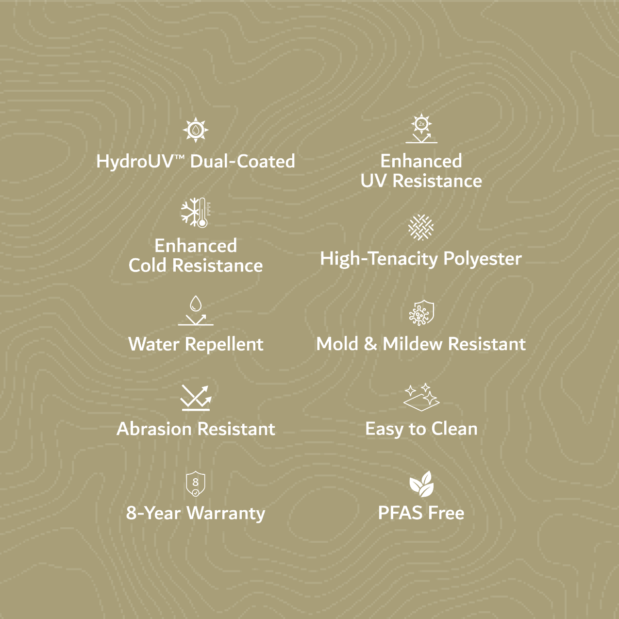 eTek® 9 oz. Coated Polyester is a heavy-duty outdoor fabric designed for long-lasting performance in marine and outdoor environments. Constructed from 100% high-tenacity polyester with a durable HydroUV™ top coating, it offers outstanding water repellency, UV resistance, and mold and mildew protection. With excellent abrasion resistance, low stretch, and superior tear strength, this 60-inch-wide fabric is ideal for boat enclosures, covers, marine tops, and bimini tops.